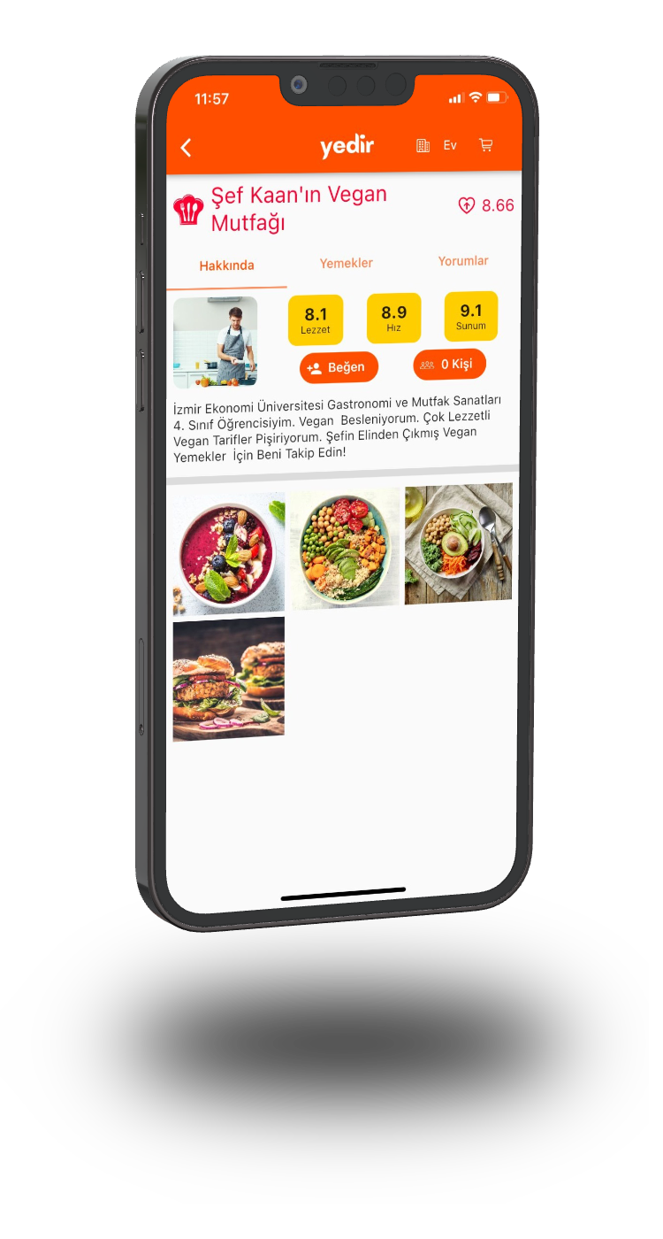 Yedir kolay kullanılabilir mobil tasarımı ile hem ev aşçılarına hem de müşterilerine gelişmiş yemek deneyimi sağlar. Uygulama üzerinden tüm siparişler kolaylıkla verilir, özenle teslim edilir.